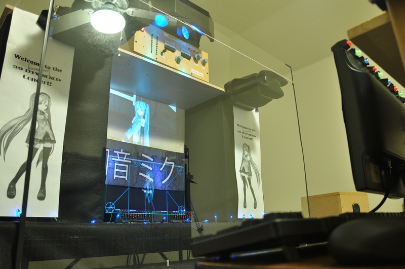 Otra opción de proyección es el utilizar una superficie semitransparente y realizar una proyección trasera. Este es el tipo de proyección que podemos observar en las presentaciones de Miku en Japón, donde son claramente visibles los proyectores.