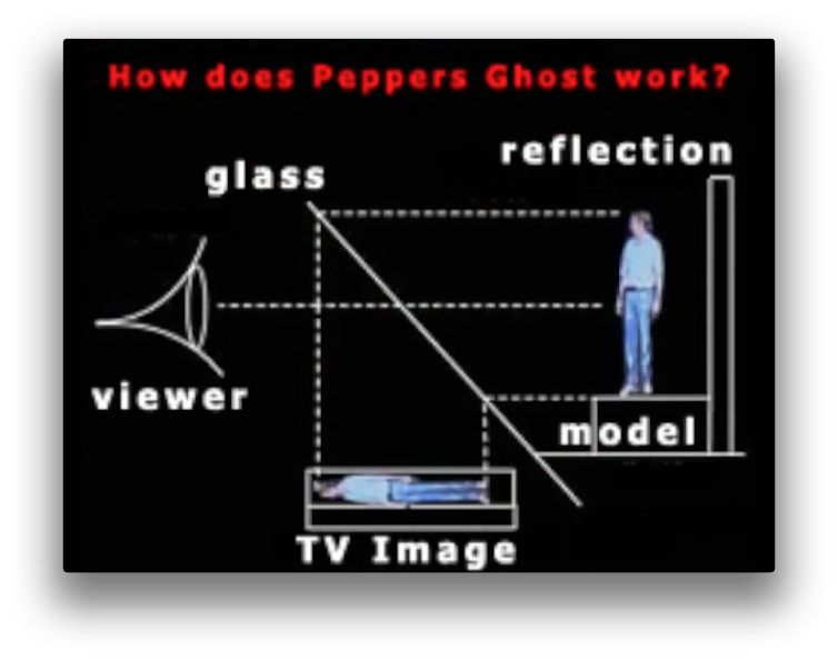 La técnica utilizada para la presentación de hologramas es llamada «Pepper’s Ghost», recientemente adaptada a las proyecciones digitales bajo el nombre de «Musion Eyeliner system». Este último consiste en la proyección a una superficie la cual será reflejada con un espejo en 45º hacia el espectador. Este espejo, al ser transparente y reflectivo, nos superpondrá la proyección con el fondo dándonos la ilusión de ver un «fantasma».