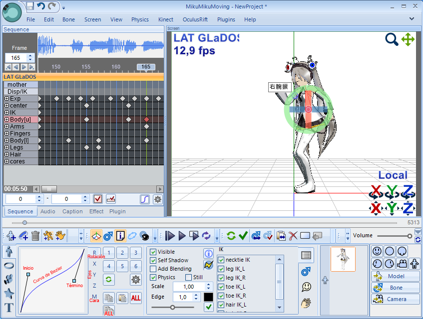 En la parte izquierda del programa se encuentra la línea de tiempo, donde podremos seleccionar un fotograma (Frame) y establecer una pose para el modelo. Debemos seleccionar un cuadro y luego un hueso a mover para poder establecerle una posición.