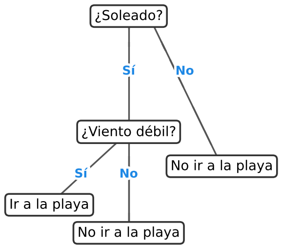 - Árbol de decisión: funciona como un diagrama de flujo invertido, con un nodo raíz que se ramifica en nodos internos y termina en hojas que representan las decisiones finales. Se entrena con datos conocidos y luego permite tomar decisiones basadas en reglas aprendidas. Por ejemplo, decidir si conviene ir a la playa según la predicción del tiempo atmosférico, oleaje y fecha.