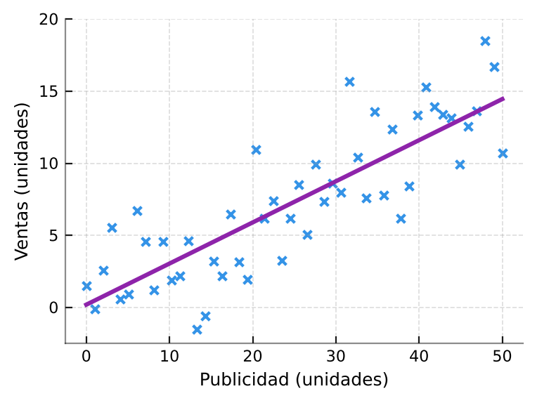 - Regresión lineal: representa la relación entre variables como una línea recta que resume una serie de puntos con cierto nivel de dispersión. Permite responder preguntas como: "Si invierto más en publicidad, ¿cuánto subirán las ventas?". El modelo matemático busca trazar la línea que mejor aproxima los datos reales para hacer predicciones simples pero útiles.