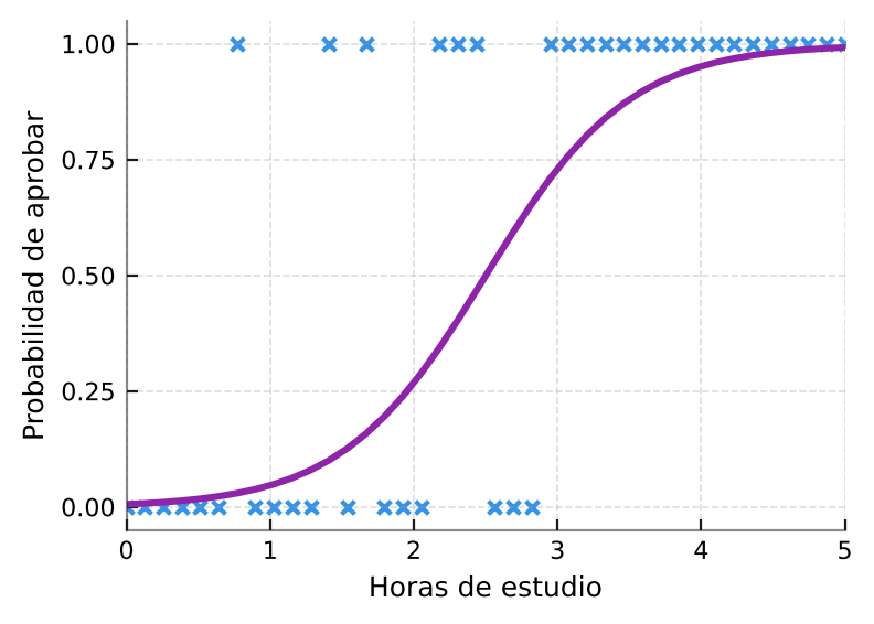 - Regresión logística: en situaciones donde el resultado es una probabilidad entre 0 y 1, se utiliza una curva en forma de S, llamada función sigmoidea. Sirve para responder preguntas como: "Con X horas de estudio, ¿cuál es la probabilidad de aprobar un examen?". A diferencia de la regresión lineal, aquí no se busca un valor exacto, sino una probabilidad de entre dos alternativas (Siguiendo el ejemplo, Aprobado/Reprobado).