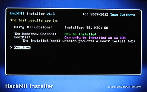 Ahora cargará Hackmii Installer, ¡el instalador del Homebrew Channel! Tras varios segundos te pedirá aprietes el botón «1» en el WiiMote. A continuación, muévete con la cruceta del control a la opción «Continue» (que quede con un fondo blanco) y aprieta «A». Instala el Homebrew Channel y Bootmii (este último tiene dos modos de instalación: ios y boot2. Solo las consolas más antiguas permiten la instalación como boot2, la cual hace las veces de seguro de vida para la consola.) Cuando finalices la instalación aprieta la opción «Exit».
