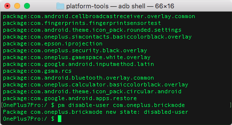 Ahora que tenemos la herramienta instalada vamos a usar el comando «adb shell» con el que conectaremos al dispositivo. La línea de comandos mostrará el dispositivo que tenemos conectado seguido de un signo $. Aquí colocaremos uno por uno el comando «pm disable-user APLICACION» reemplazando aplicación por el nombre del paquete a modificar, Por ejemplo «adb shell pm disable-user net.oneplus.odm.provider».